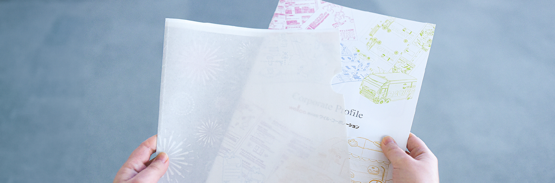 ほんのり透ける半透明タイプは、PP製クリアファイルのように使用でき、紙製なのでリサイクルが容易。書き込みや後追い印刷も行えます。