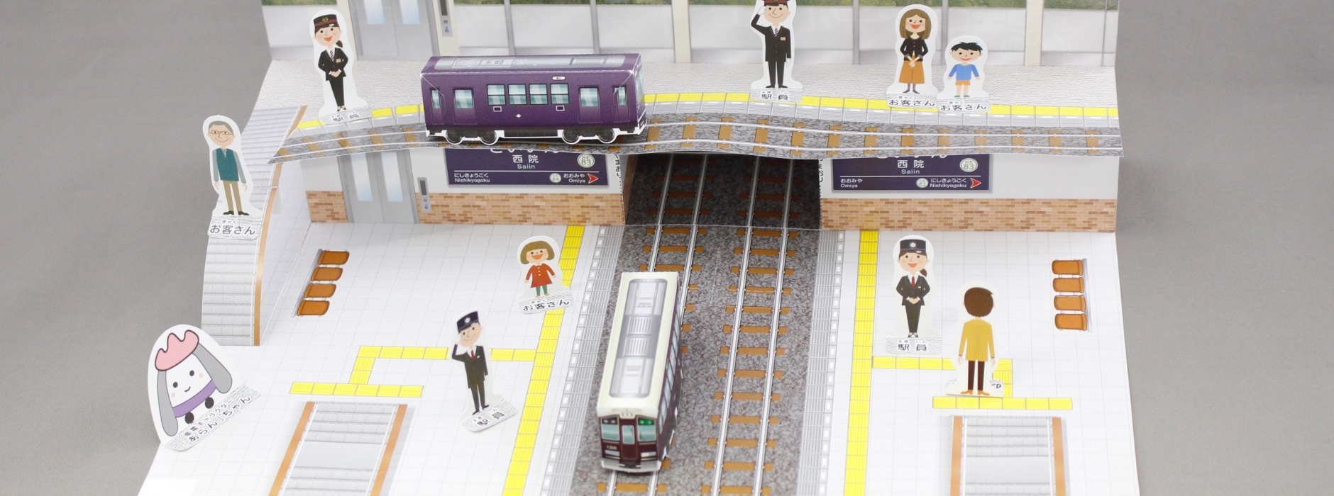 立体的なペーパークラフトなら「地上の駅(嵐電)と地下の駅(阪急)が快適に繋がる構造」を位置関係がイメージしやすく再現することができる。