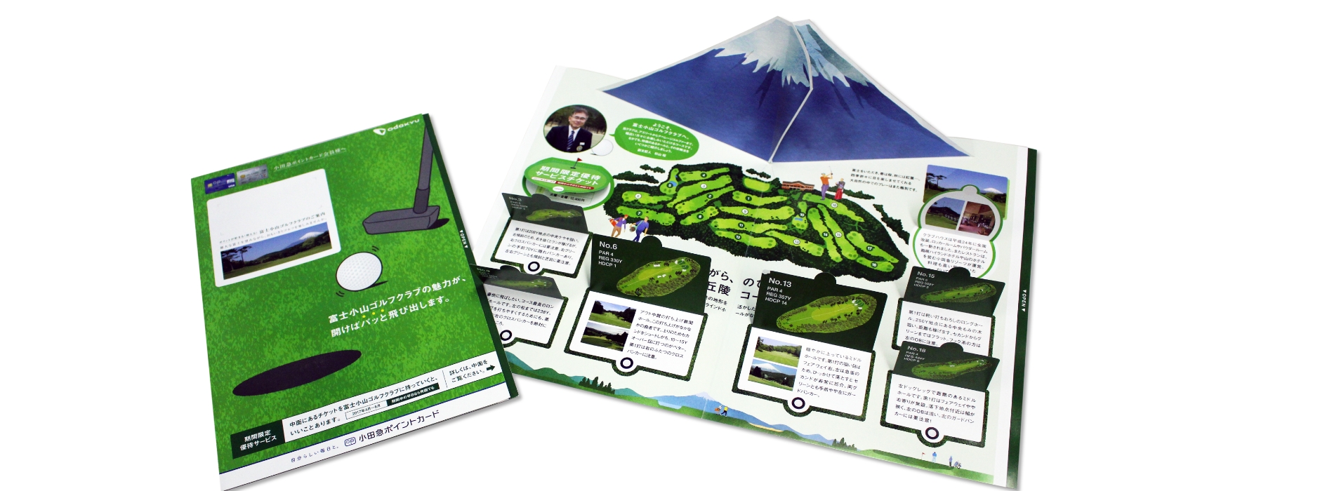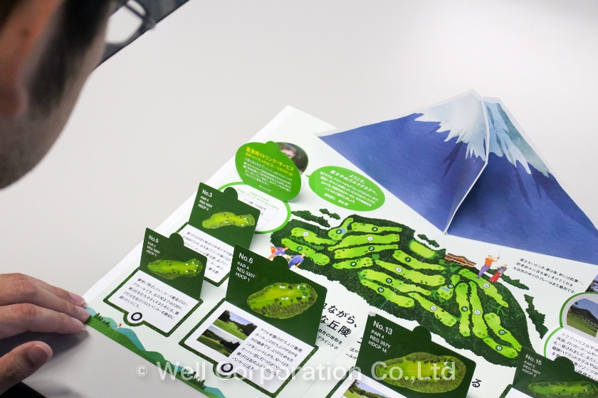 まず、DMを受け取り、開いた際に、富士山のイラストが目の前に飛び出してくる仕掛けを設けた。飛び出した富士山の下には、当ゴルフ場コースを配置することで、“富士の麓にあるゴルフ場”であることを印象強く表現した。