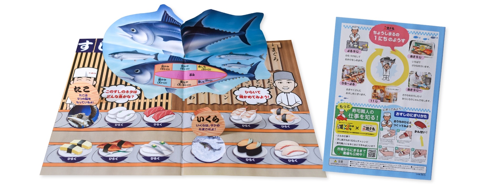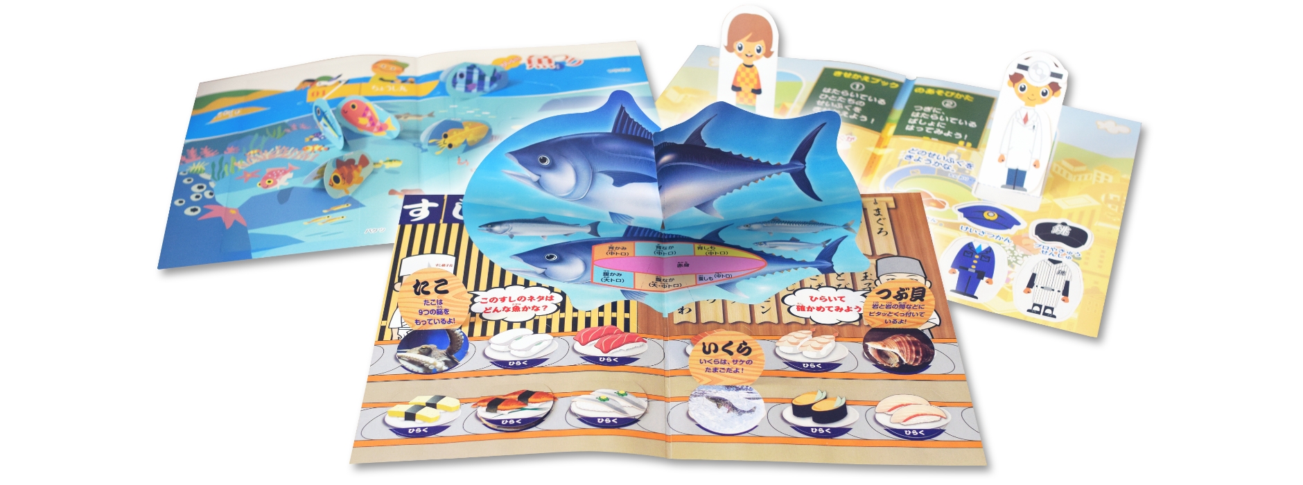 組み立てたりゲームで遊べるなど、趣向の異なるバリエーションの豊富さも魅力的で、当初予定になかった3種類(楽しく学べる“すしぞくかん”知育用BOOK、女の子が大好きな着せ替えシールブック、ゲーム性の高い男の子用魚釣りゲーム)の同時採用をすることに決めました。