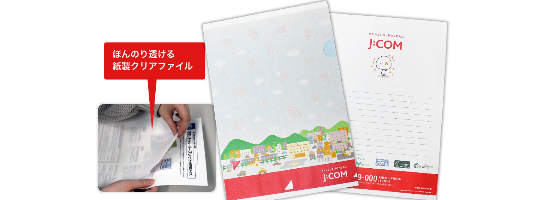 SDGsへの貢献に加えて、ファイル自体が自由な形状でオリジナルデザインが可能だったこと、従来使用していた名刺ポケット付きPP製クリアファイルと同程度のコストで制作できることが決め手となった。