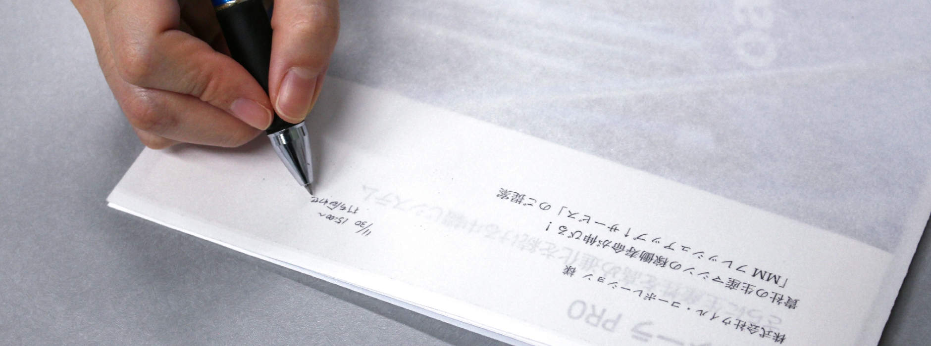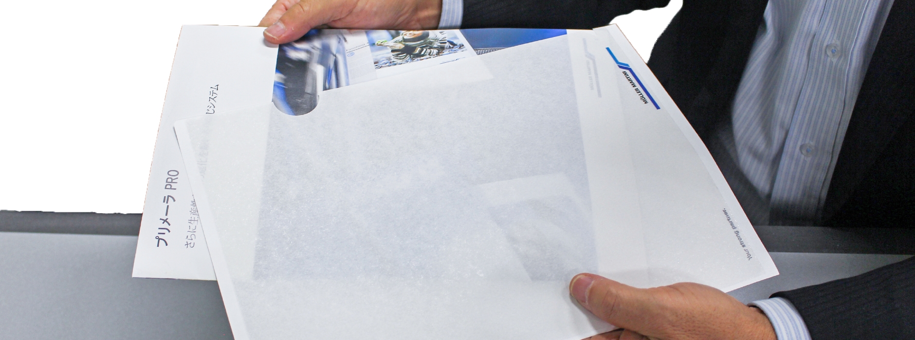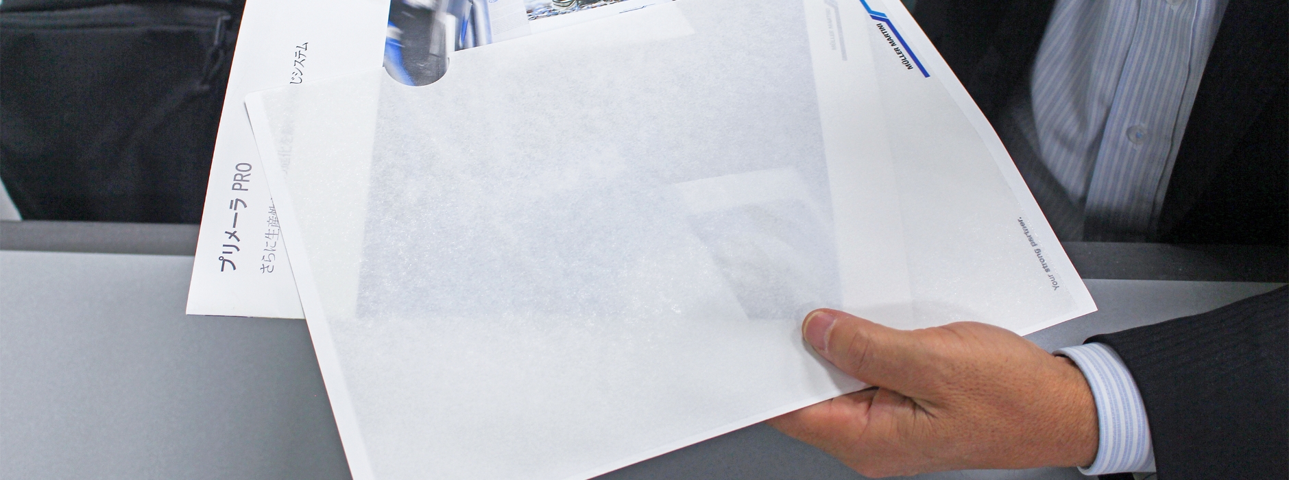 提案いただいた「プラゼロファイル」は、紙ファイルなのに内容物が透けて見えるので、営業用に製品紹介パンフレット等を入れてお渡しする際も内容物が一目瞭然で、従来使用していたプラスチック製クリアファイルと遜色なく使えるところが良い点だと感じました。