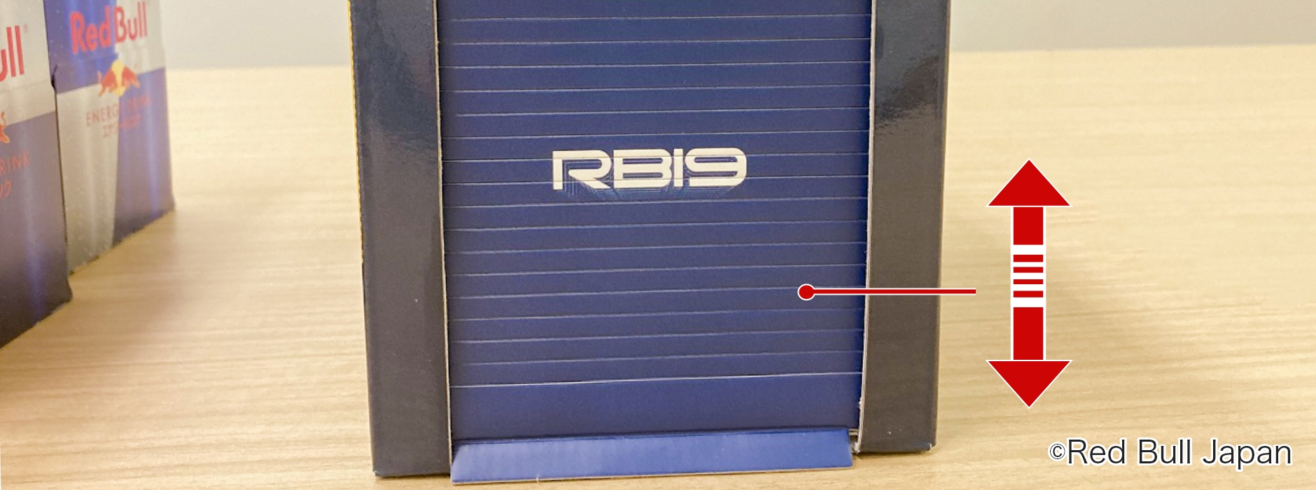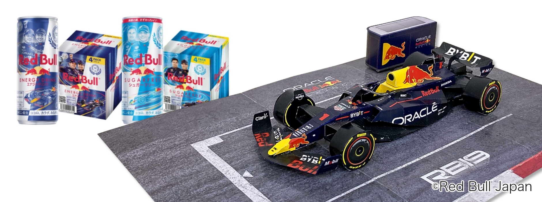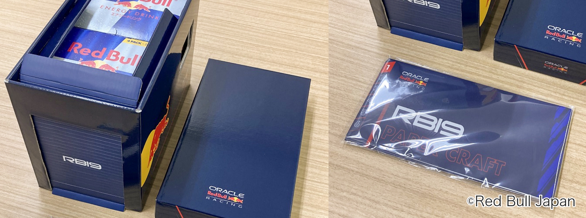 ・レッドブル限定F1缶8缶に当社が制作した「レッドブルF1マシン(RB19)の魔法のペーパークラフト」と「専用の外箱(ガレージ)」がセットになった商品。