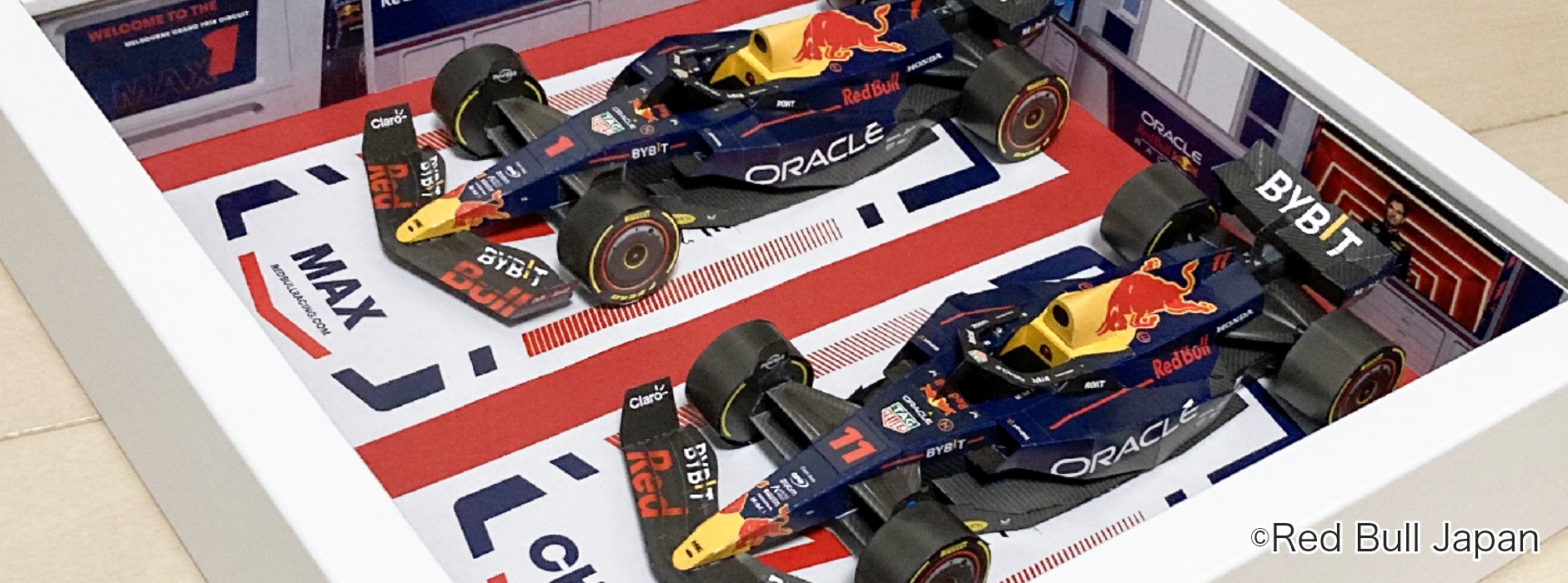 「最新のレッドブルF1マシンをペーパークラフトで再現したい」「オリジナリティがあり、ファンが喜ぶキャンペーンを行いたい」そんなご要望に応えるべく、今回は過去にないほどクオリティを突き詰めたペーパークラフトと、F1ガレージデザインを施したケースをセットにしてご提案しました。