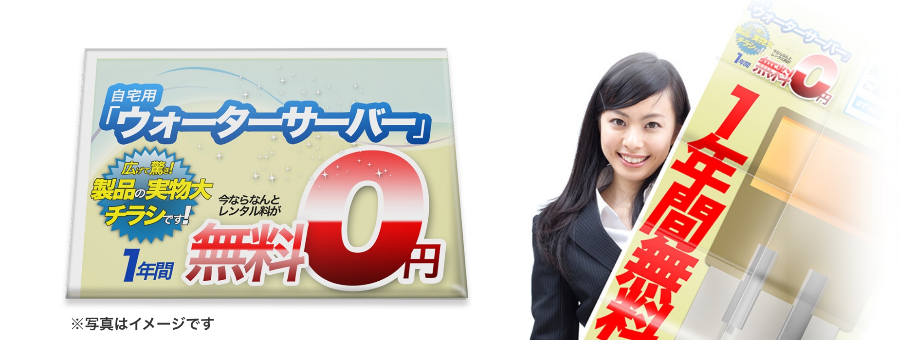 通販同梱用チラシとして実施。スリム設計のウォーターサーバー現物の大きさを原寸大で見てもらい、設置場所をイメージしてもらうことを狙いに企画・作成。